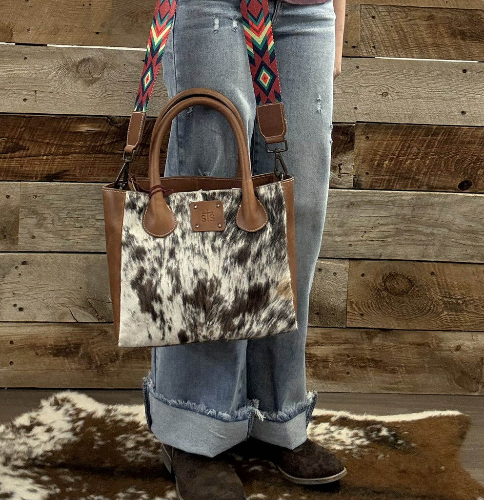 The Cowhide Basic Bliss Satchel is a unique take on the classic Basic Bliss Collection with the addition of hair on hide accents.
