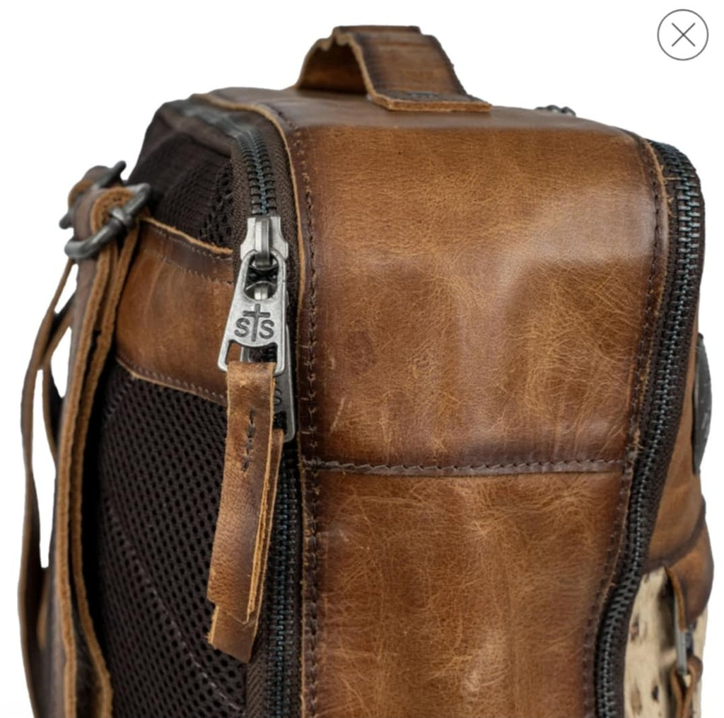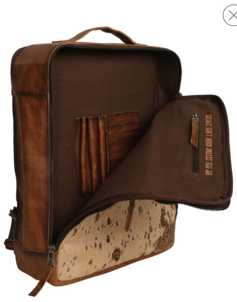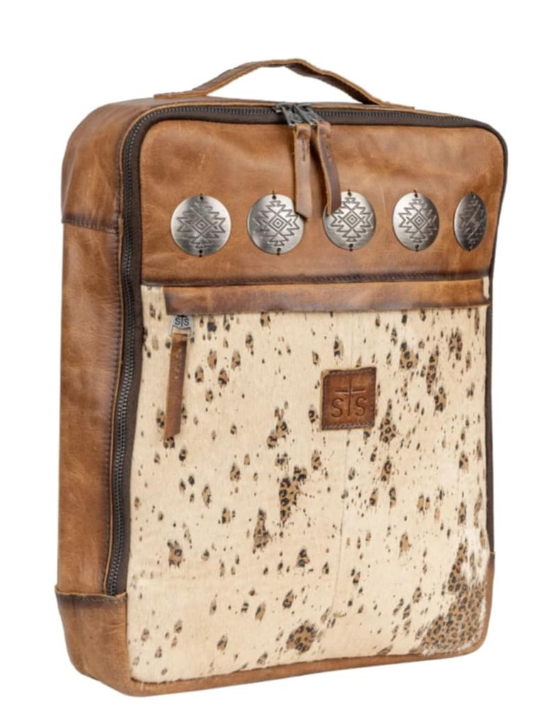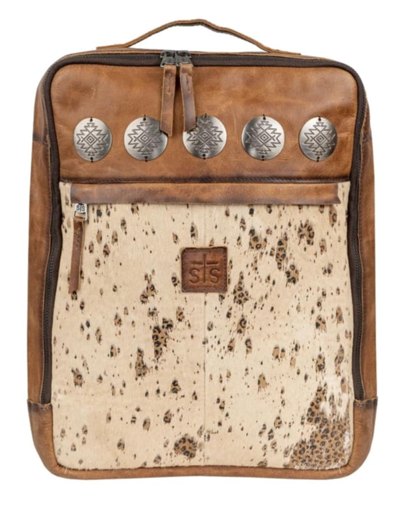 The Serengeti Lennon Backpack features a unique baby leopard print scattered throughout hair-on-hide cowhide. Finished with a distressed full grain buckskin leather and large rustic conchos, this collection is a "must-have" of the season.