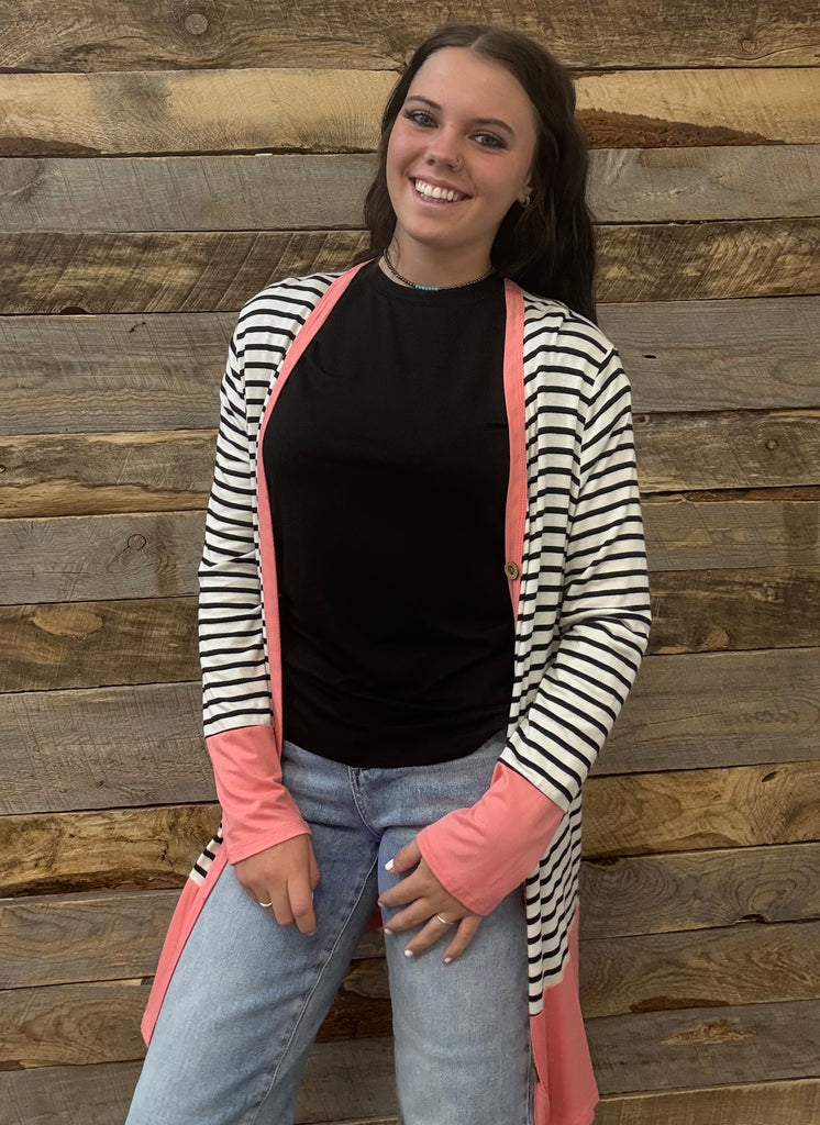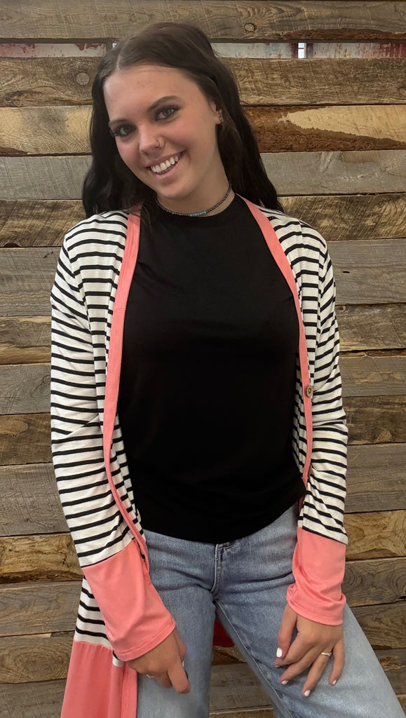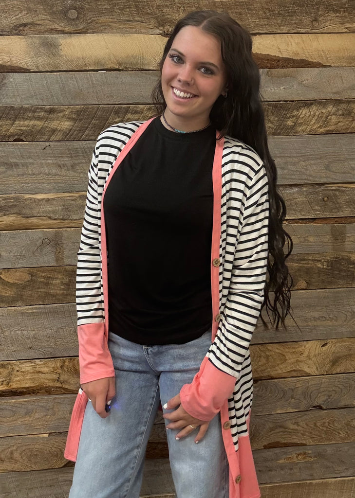 Long sleeves striped cardigan solid contrast at sleeves and bottom button details, faux closure **cardigan does not close**