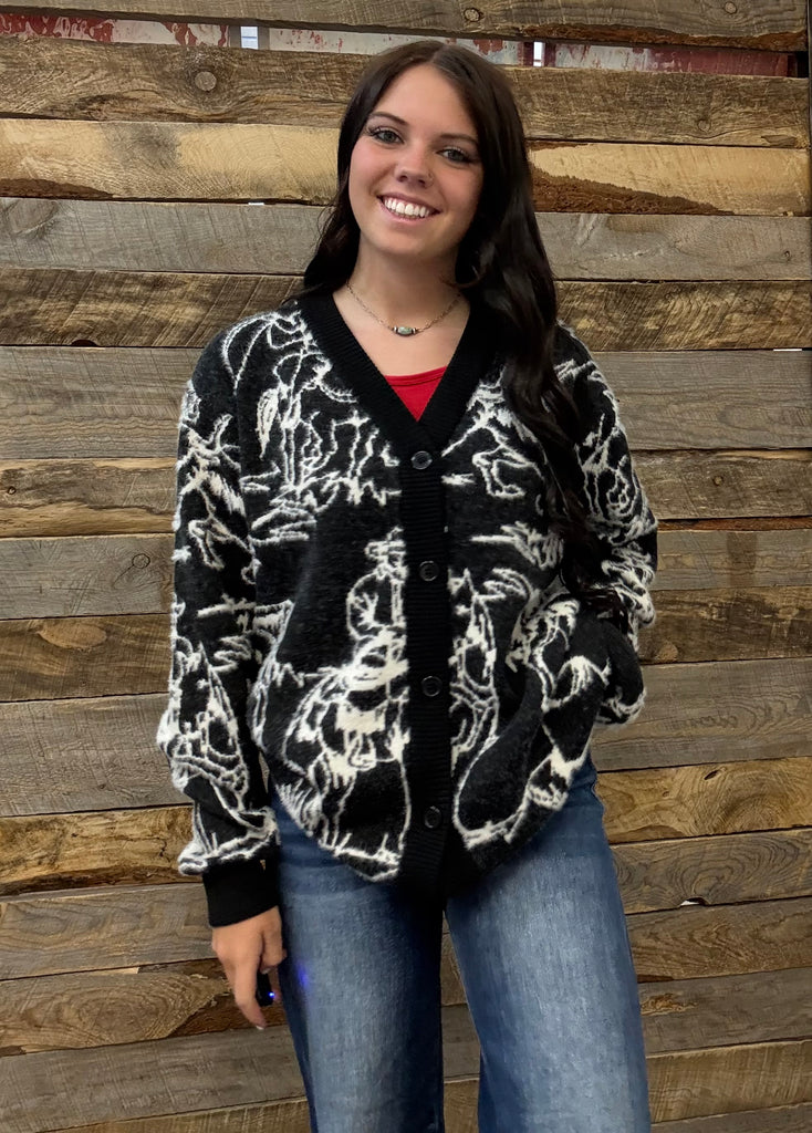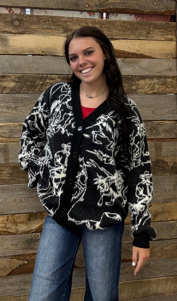 Discover the charm of The Rodeo Star Cardigan, featuring playful buttons and crafted with an innovative knit technique we’re excited about. This ultra-soft, fuzzy knit offers exceptional comfort and versatility. Perfect for a polished business casual look or to evoke classic western elegance. The black and white design comes in an oversized fit—consider sizing down for a more tailored silhouette.