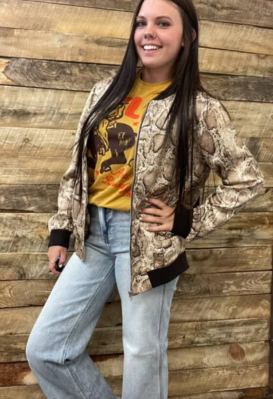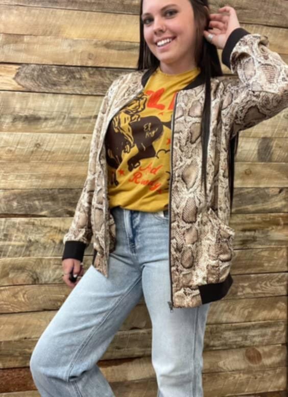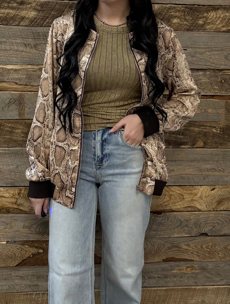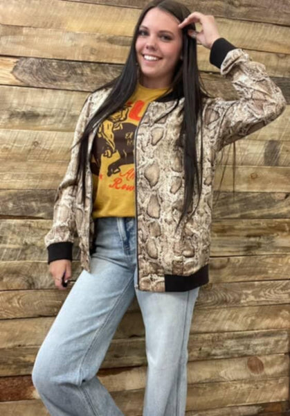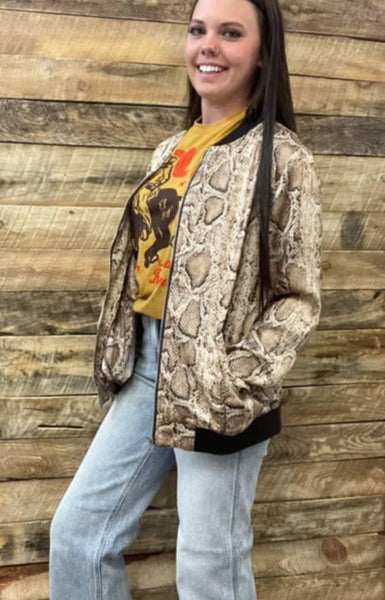 This stylish python print bomber jacket is a bold and stylish statement piece that is sure to turn heads, whether you're dressing up for a night out or dressing down for a casual day.