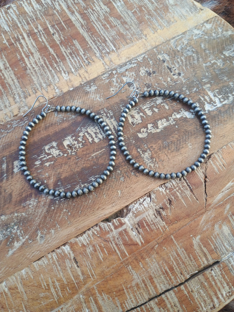2.5" Long, Tiny 4mm Navajo Pearl, 65mm Hoop Earrings * 2.5" long earrings & fish hook * 2.5"(65mm) diameter hoop * 4mm navajo pearl * Light! Each earring 3 grams weight * Nickel, Lead & Chrome free