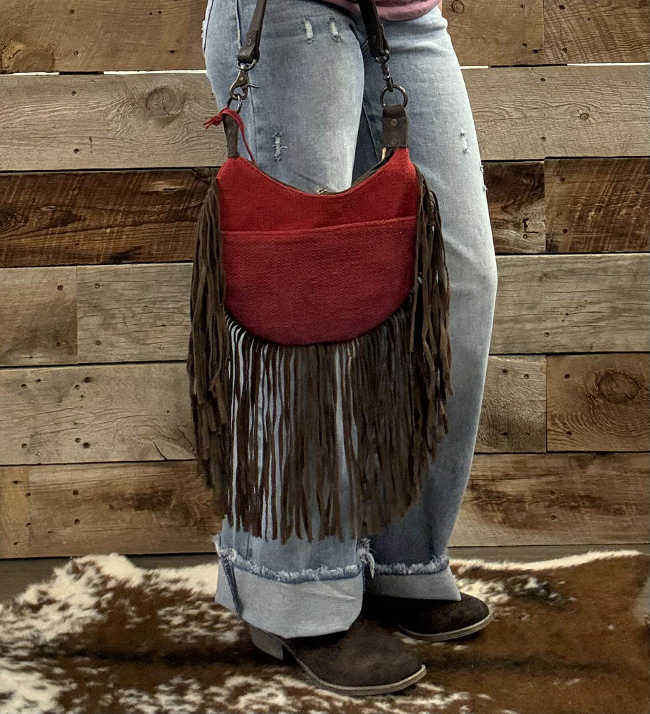 The Eastern Skies Shoulder Bag Purse is the perfect combination of crimson red serape and matte-natural chocolate full grain leather. The features ombré, Aztec pattern unique to the shape of the bag.