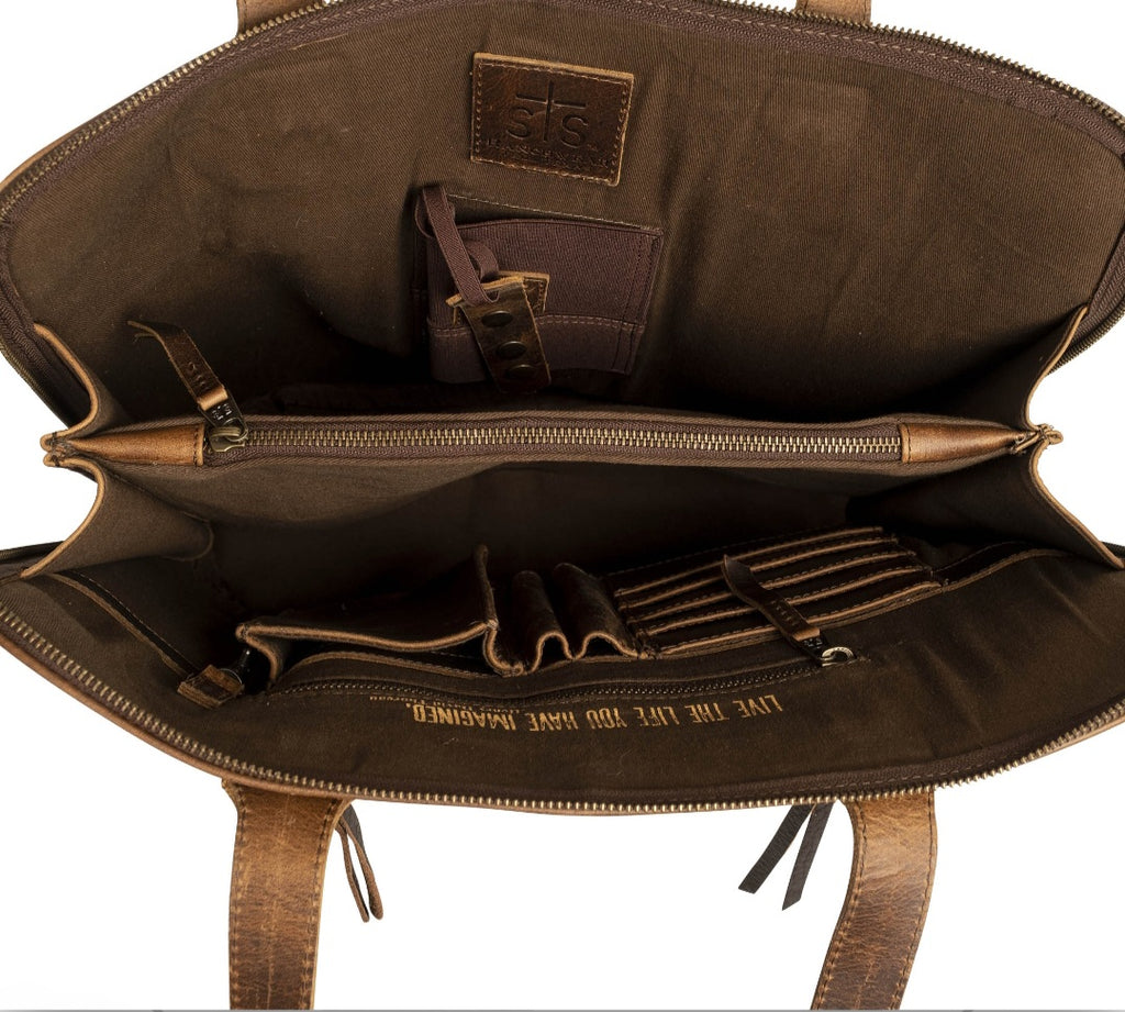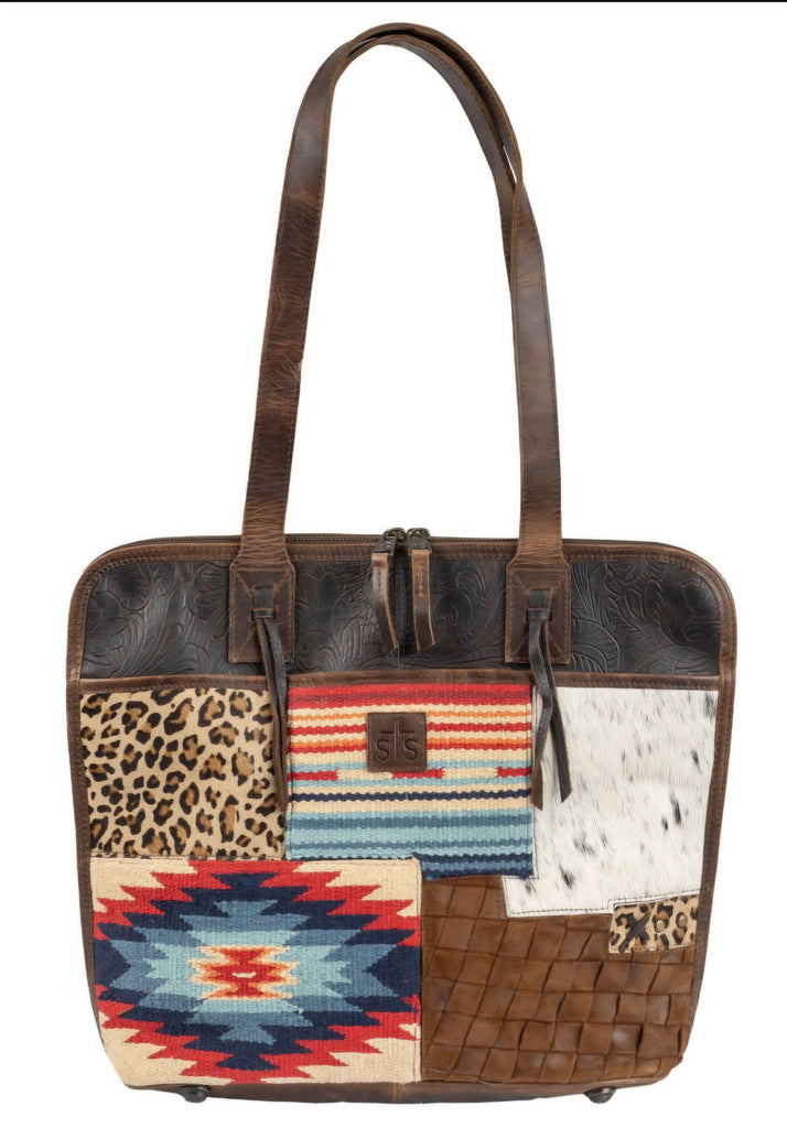 The Cheyenne Mountain Laptop Shopper combines an array of full grain and hair on hide leathers with colorful serapes for a unique, vintage feel.