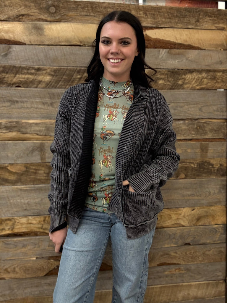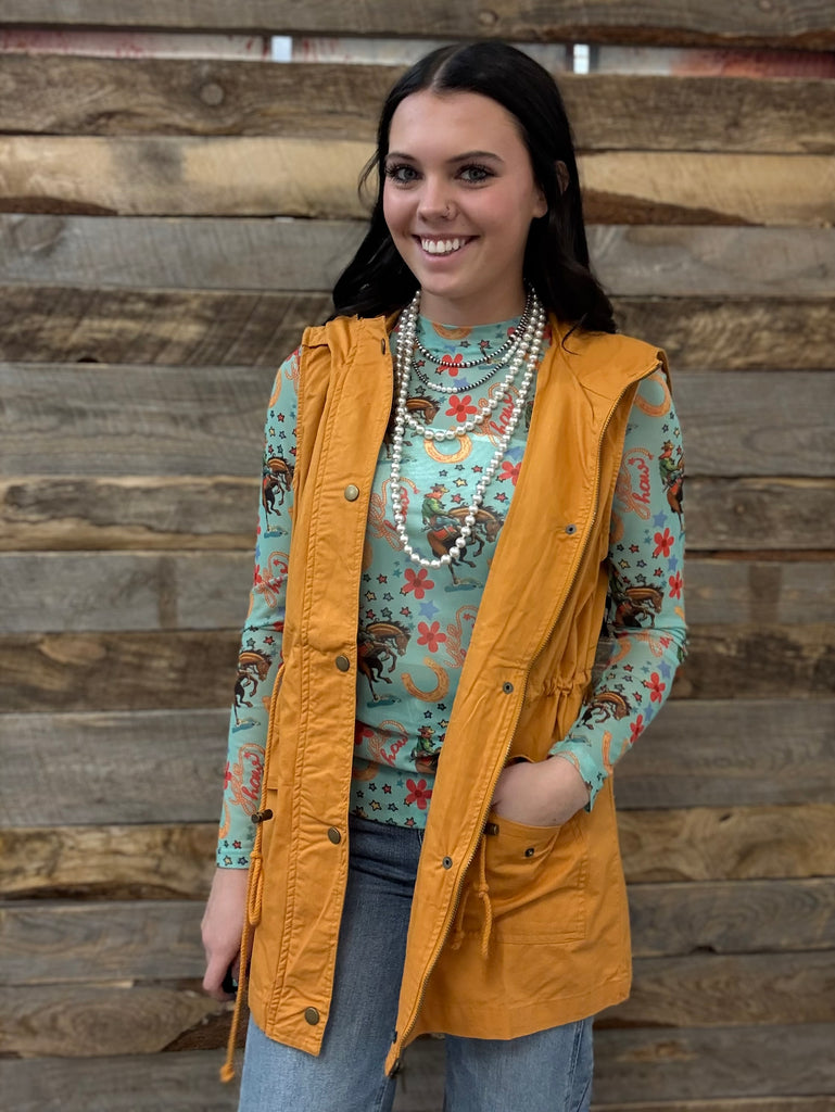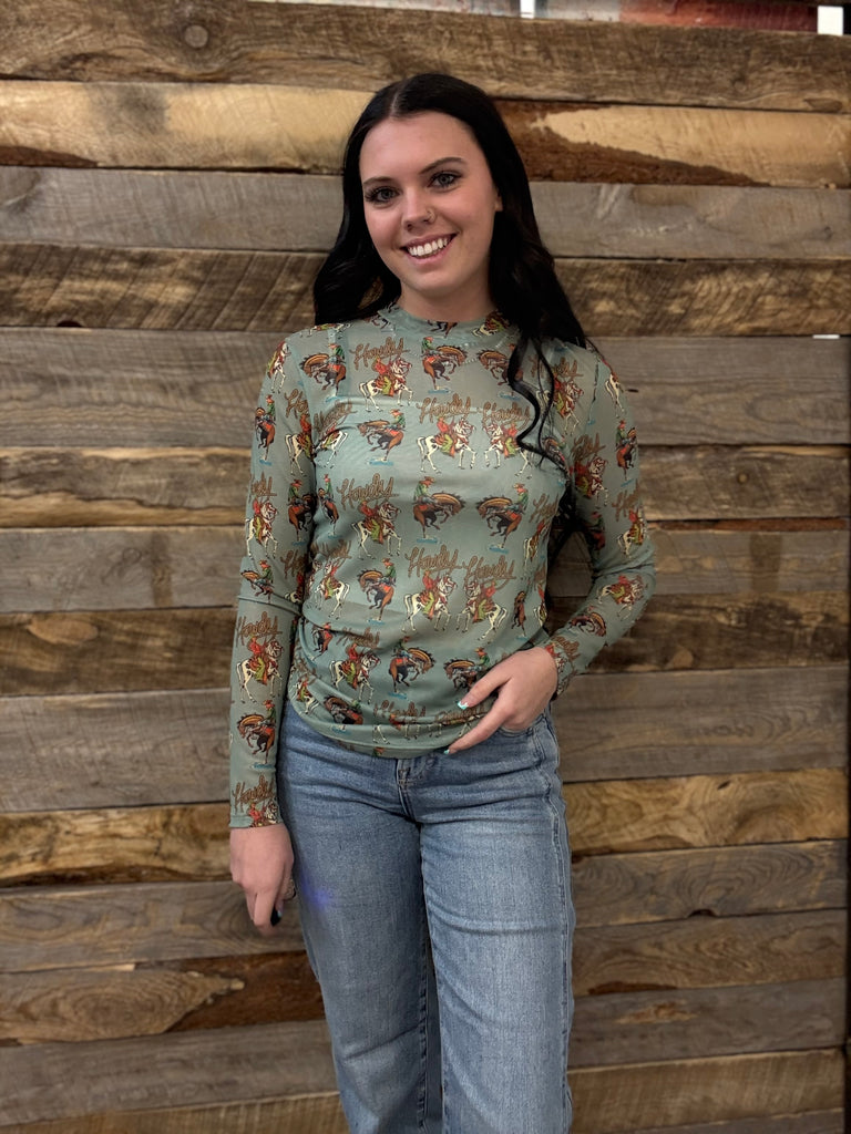 This Western-themed mesh top features an allover vintage-style cowboy print with riders on horseback and repeating “Howdy” script across a muted teal background. Made from sheer stretch mesh, it’s a standout layering piece with a playful retro vibe.