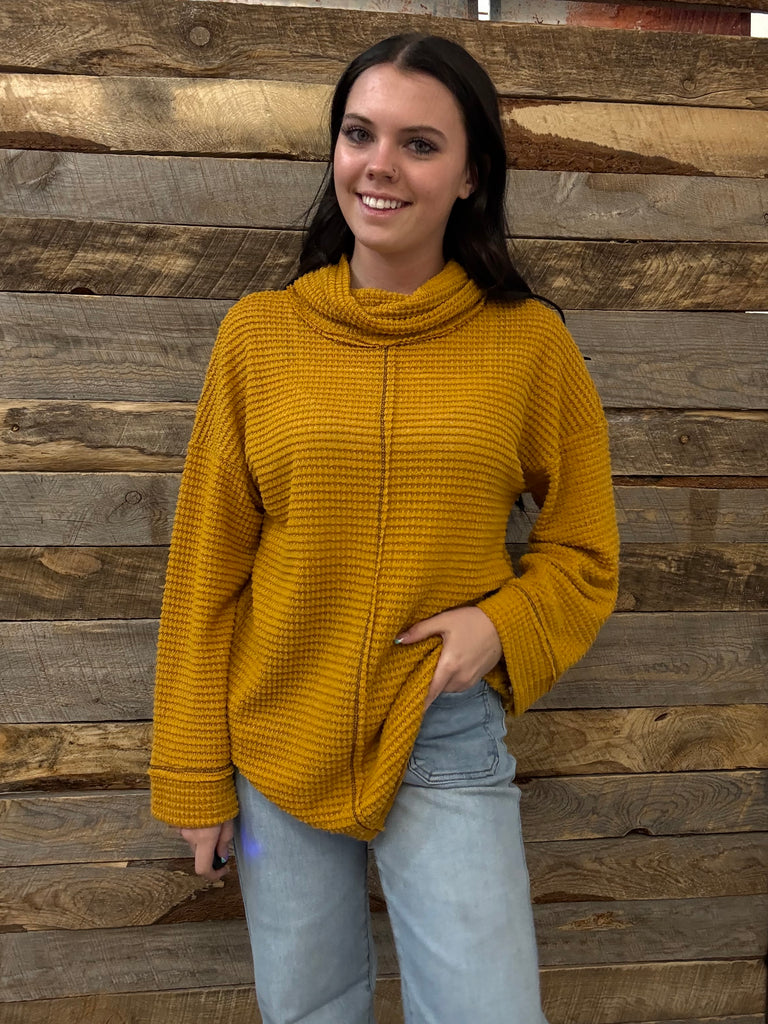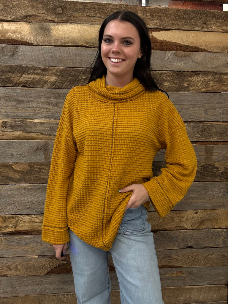 POPCORN WAFFLE TURTLE NECK TOP WITH CONTRAST STITCHING DETAIL