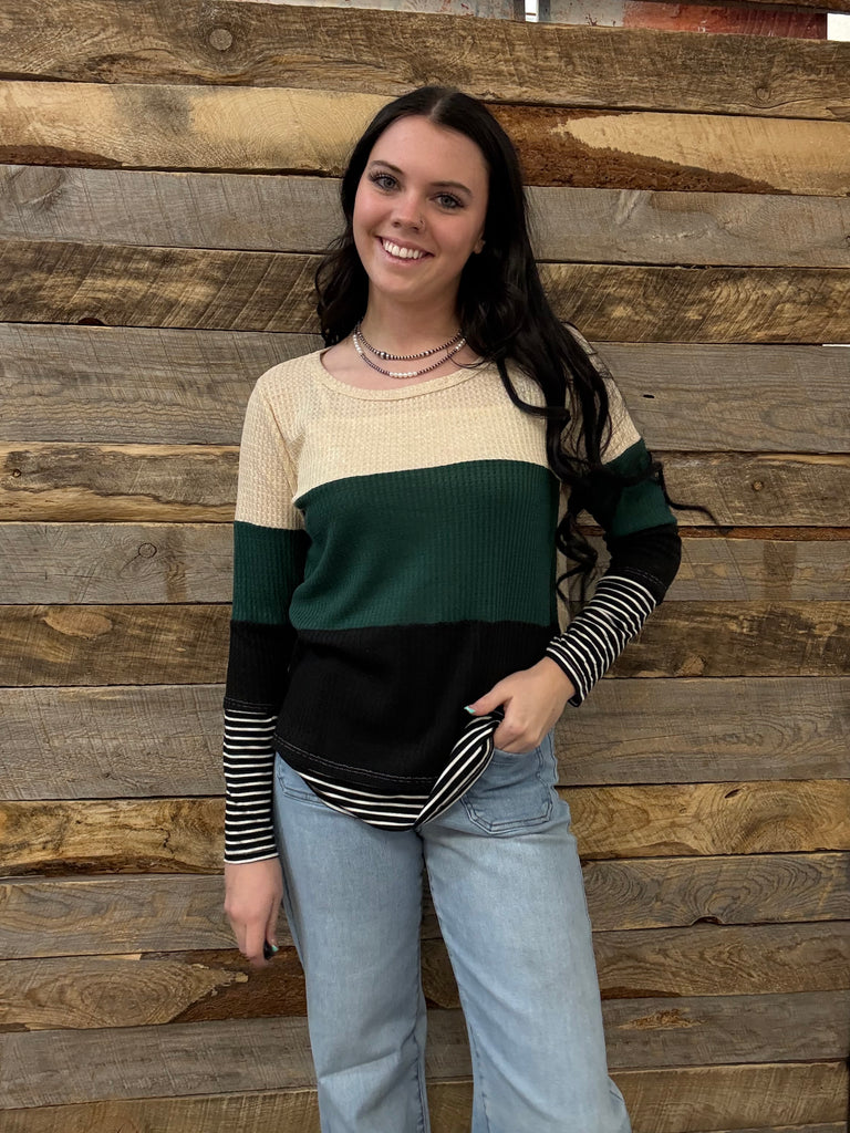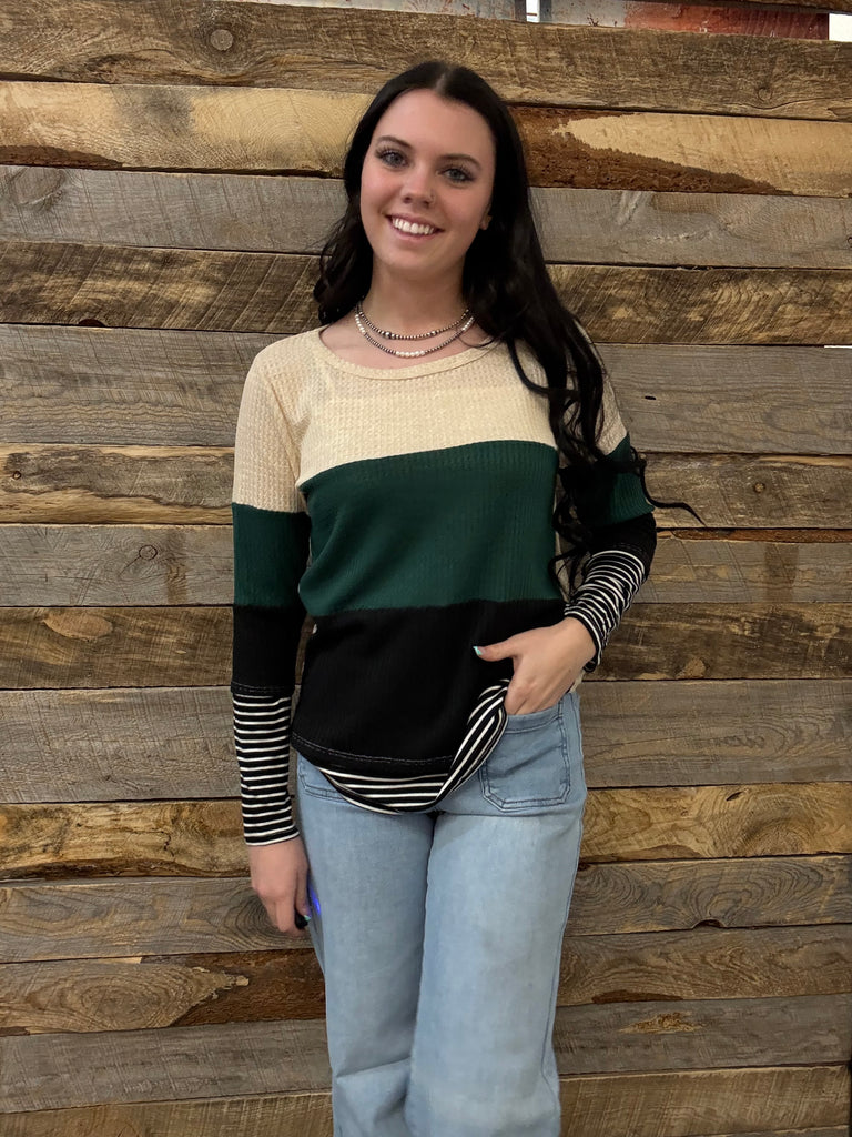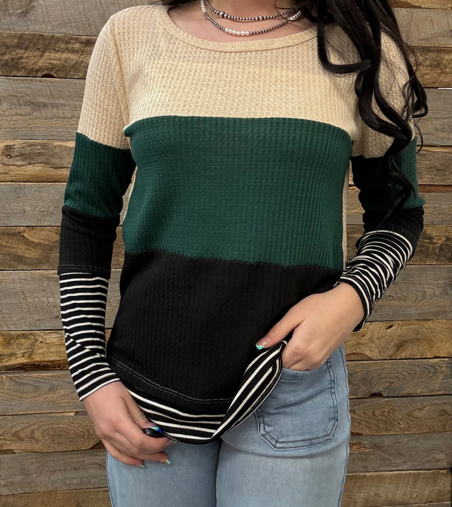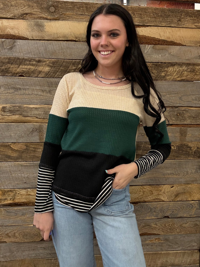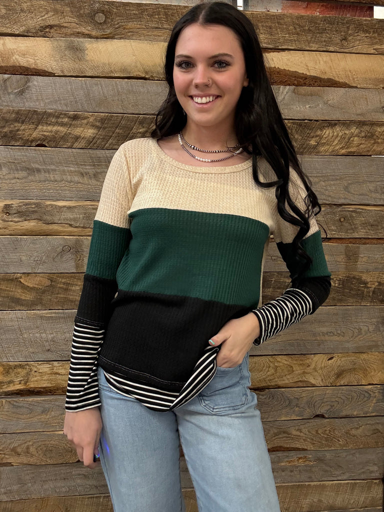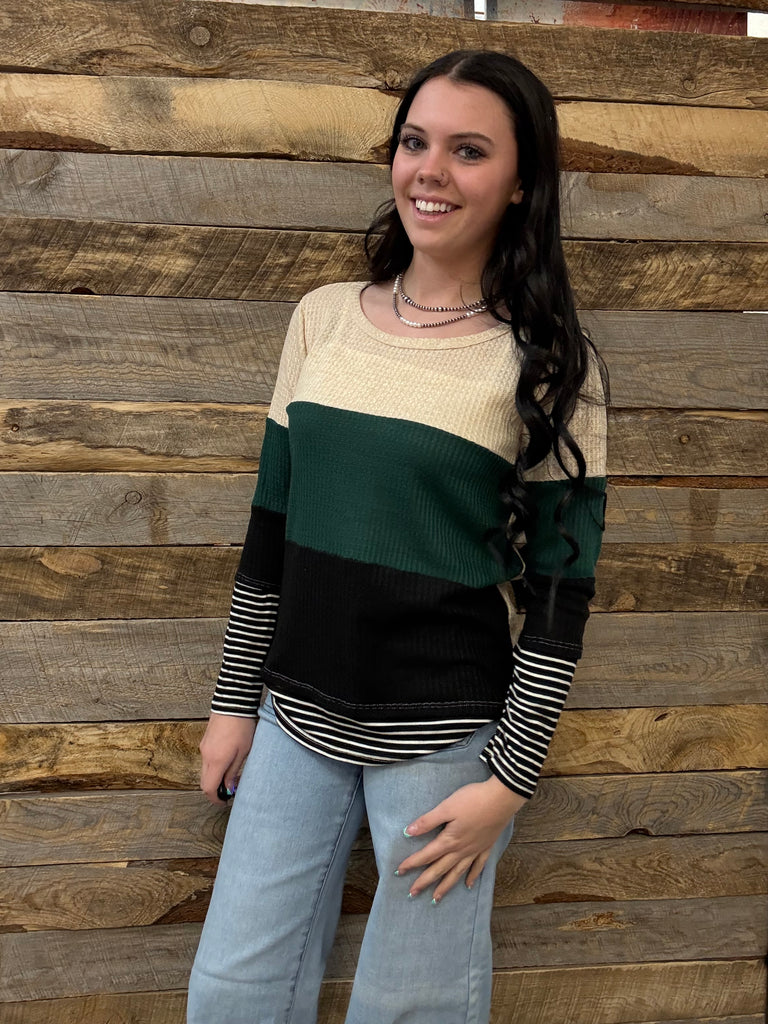 Thermal Waffle Color Block Top With Pin Stripe