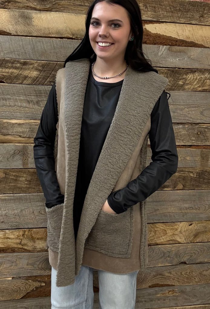 This vest features a hood with pockets on both sides, and is lined with Sherpa for added warmth. Its raw seams provide durability without looking too bulky.