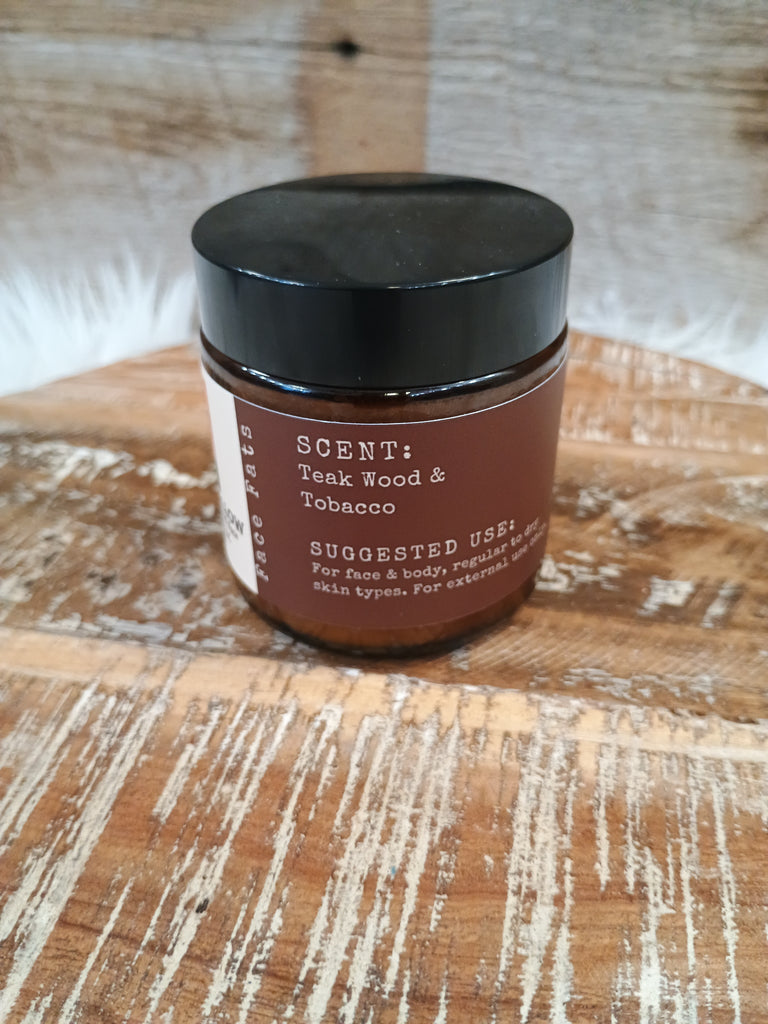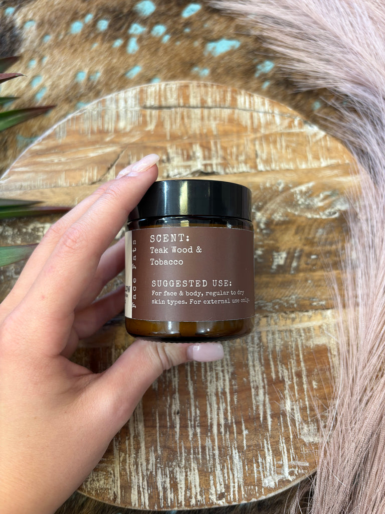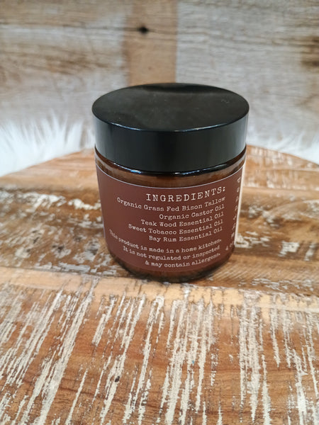 Ingredients: Organic Bison Tallow, Organic Caster Oil, Sweet Tobacco Essential Oil, and Teakwood Essential Oil