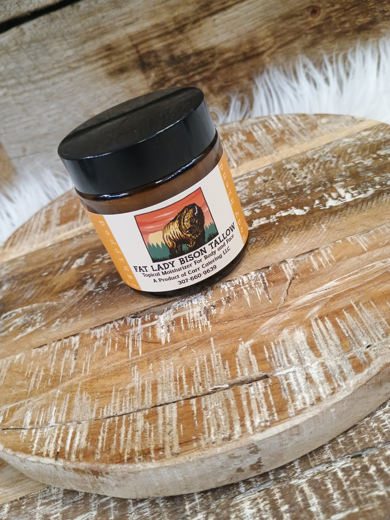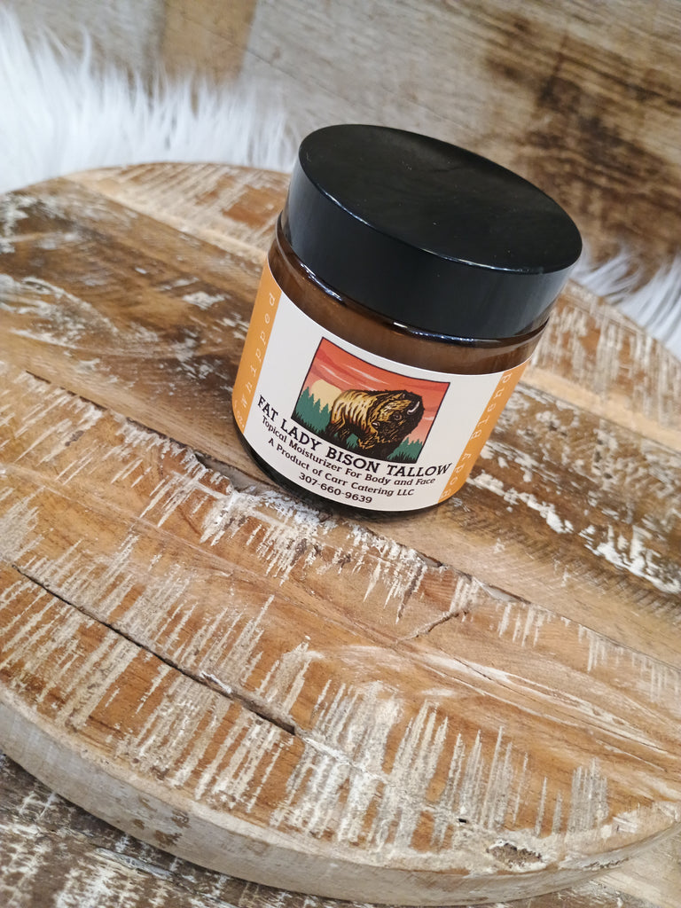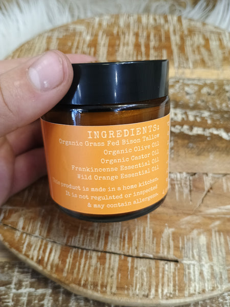 Ingredients:  Organic Bison Tallow, Organic Caster Oil, Organic Olive Oil, Frankincense Essential Oil, and Wild Orange Essential Oil