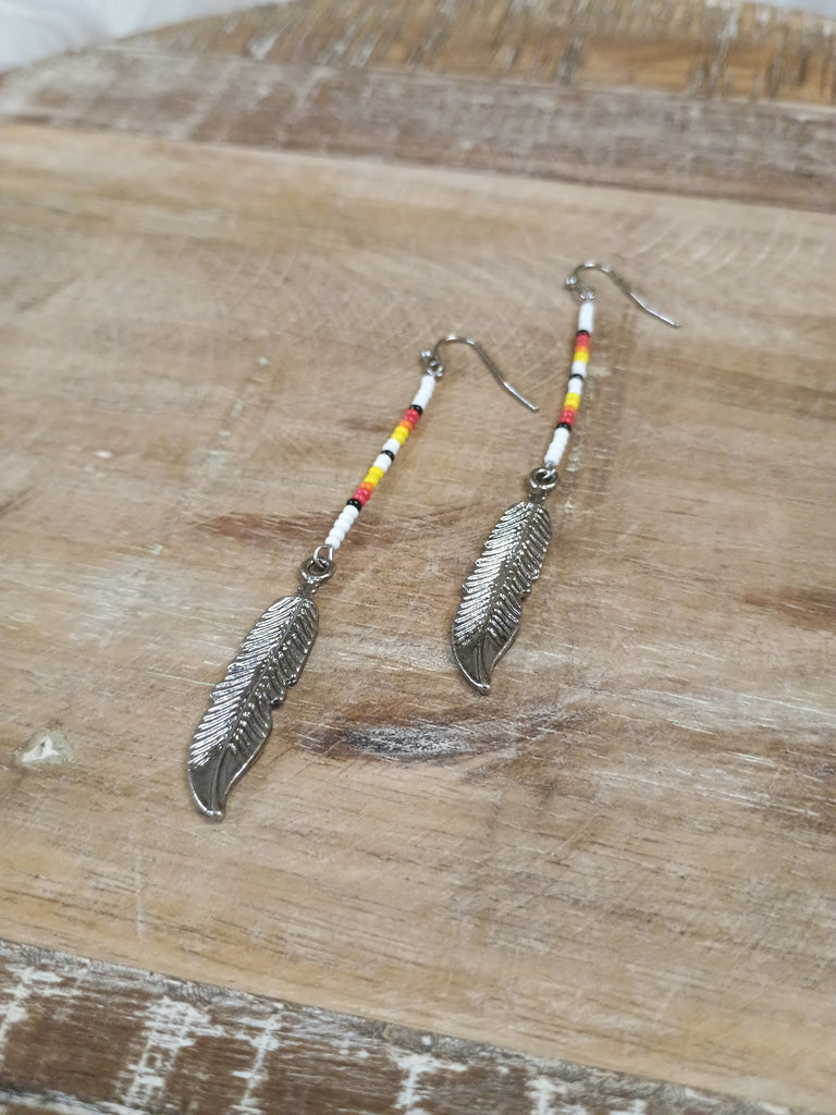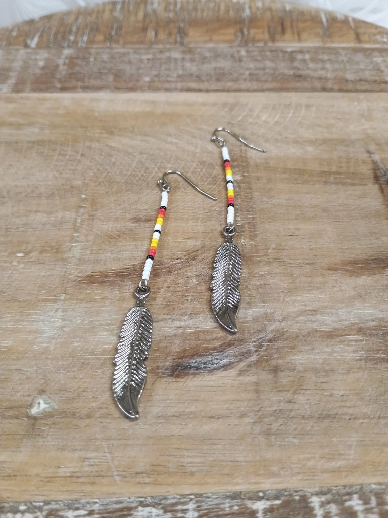 Get ready to Follow Your Arrow with our new, lightweight, beaded earrings. These dangle earrings are made from multicolored beads with a silver feather charm at the end. Perfect for casual or dressy outfits!