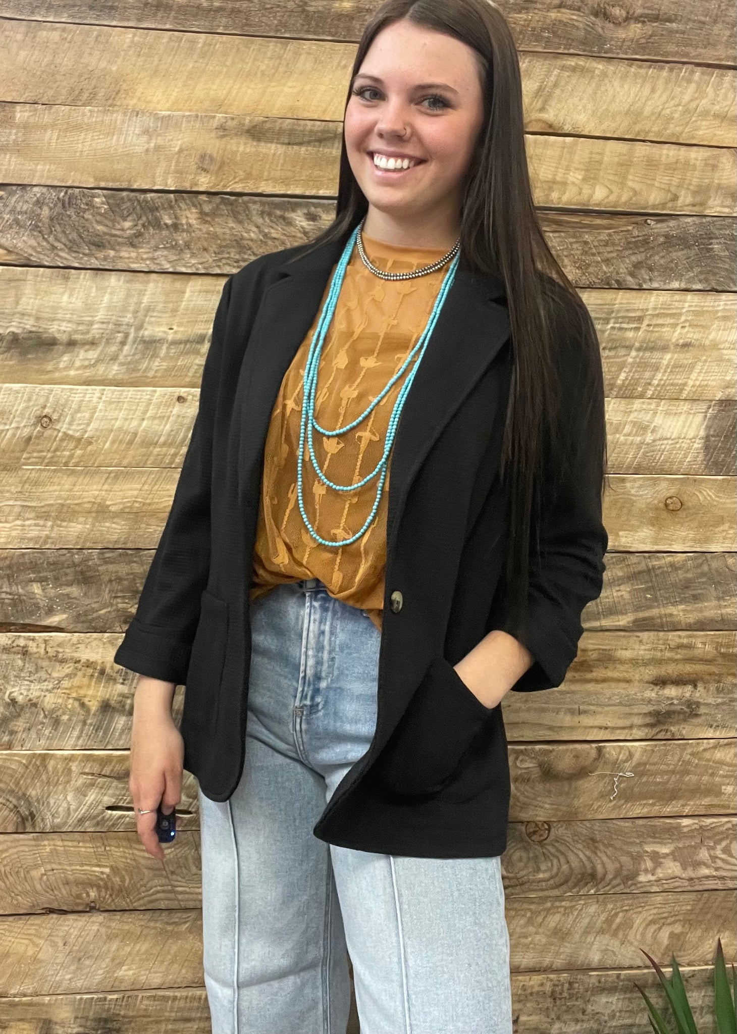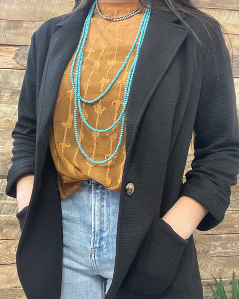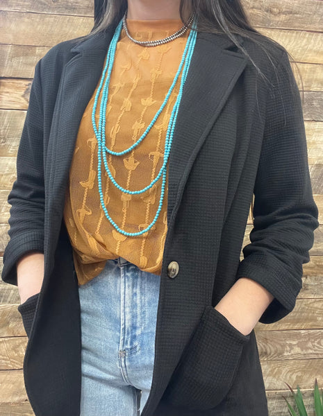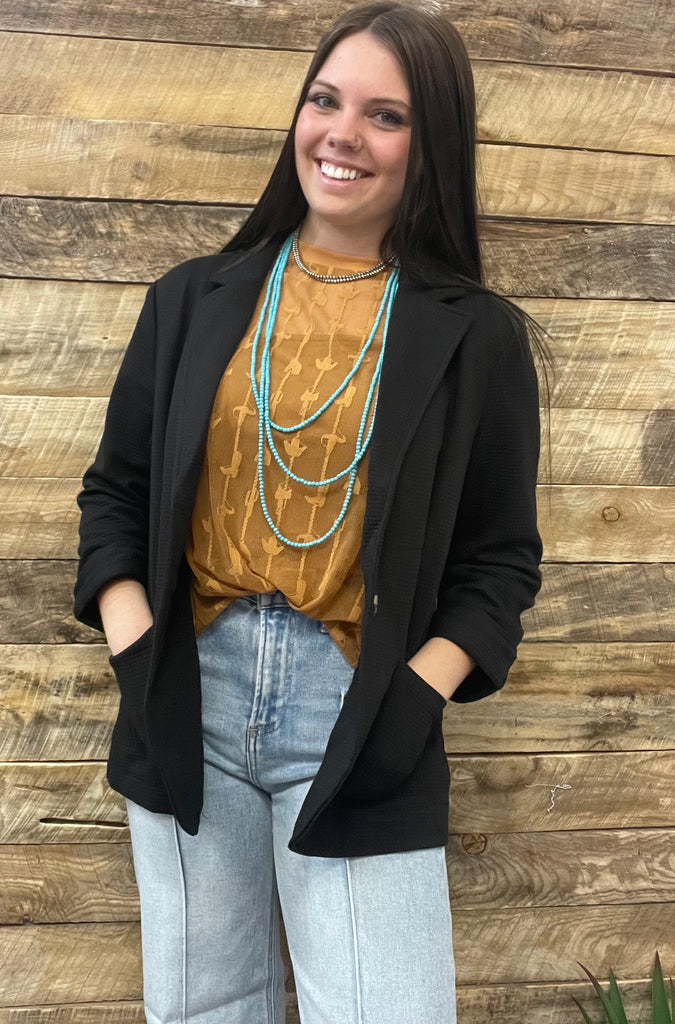 This is stretchy, fitted, and perfect! This black blazer features a subtle waffle texture and is very professional while being super comfy!