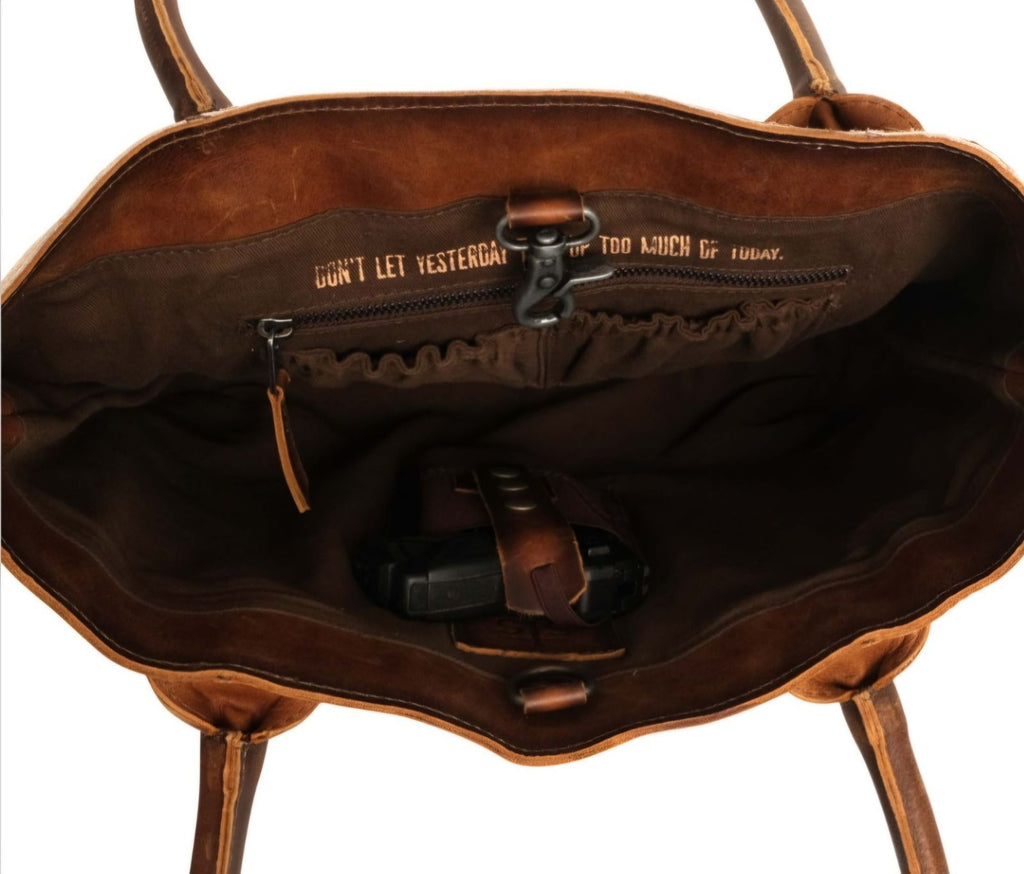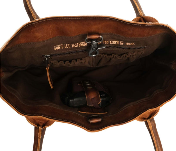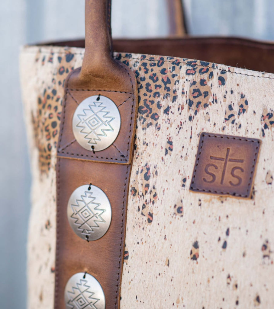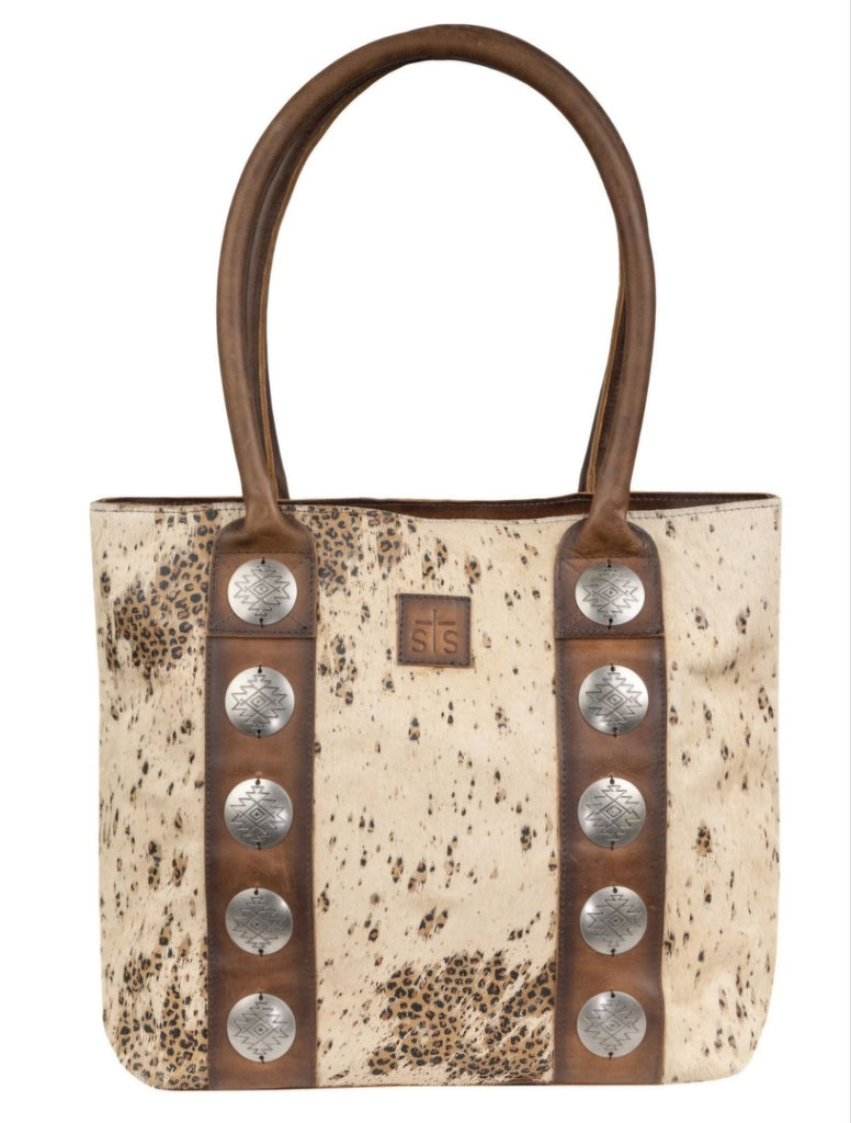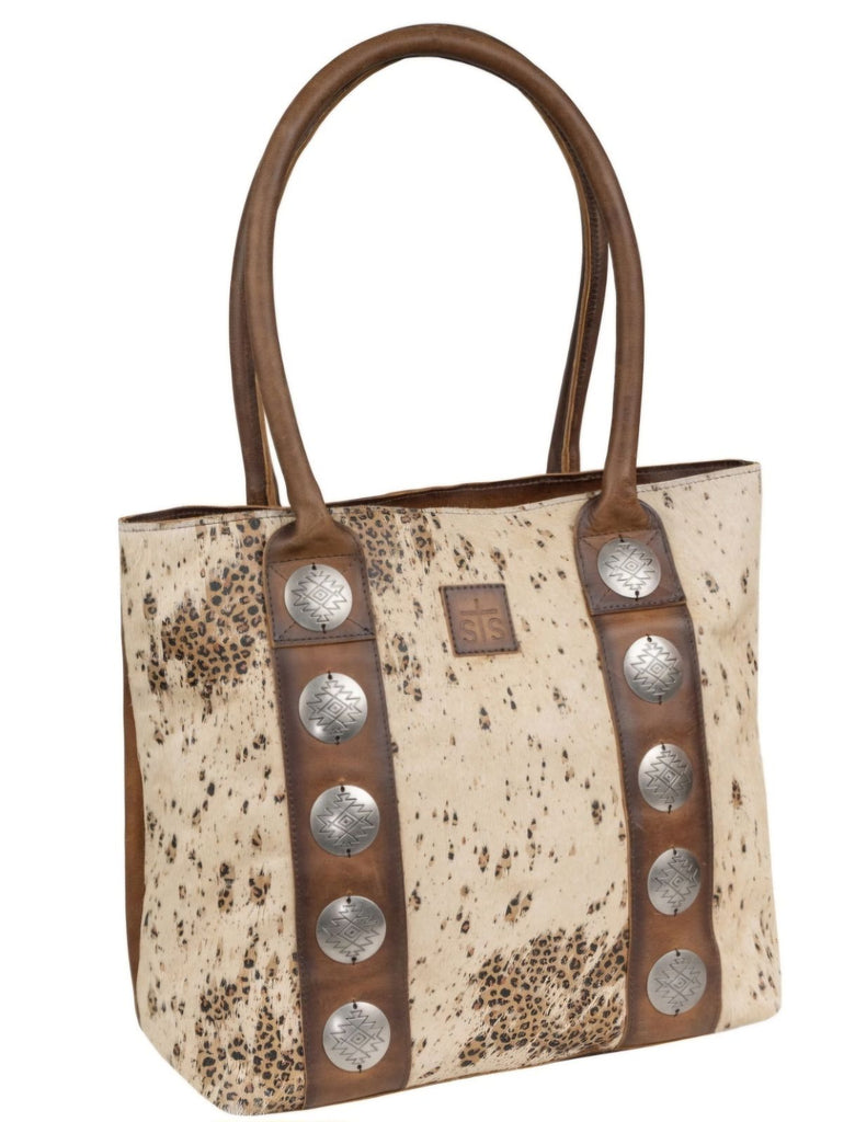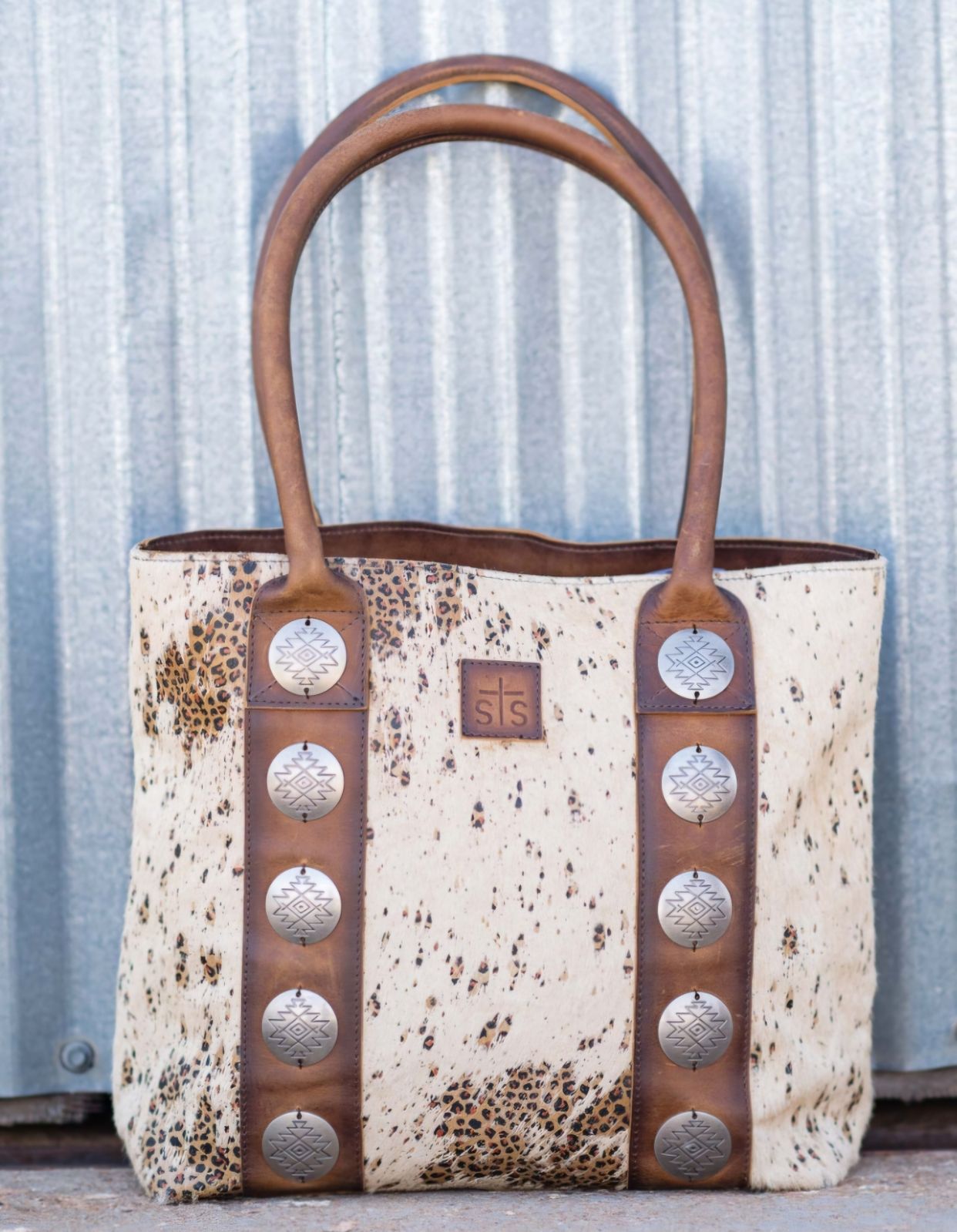 The Sweet Time Tote Purse features a unique baby leopard print scattered throughout hair-on-hide cowhide. Finished with a distressed full grain buckskin leather and large rustic conchos, this collection is a "must-have" of the season.