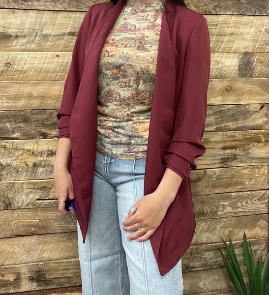 3/4 Ruched Sleeve Blazer with Pockets and Shoulder Pads