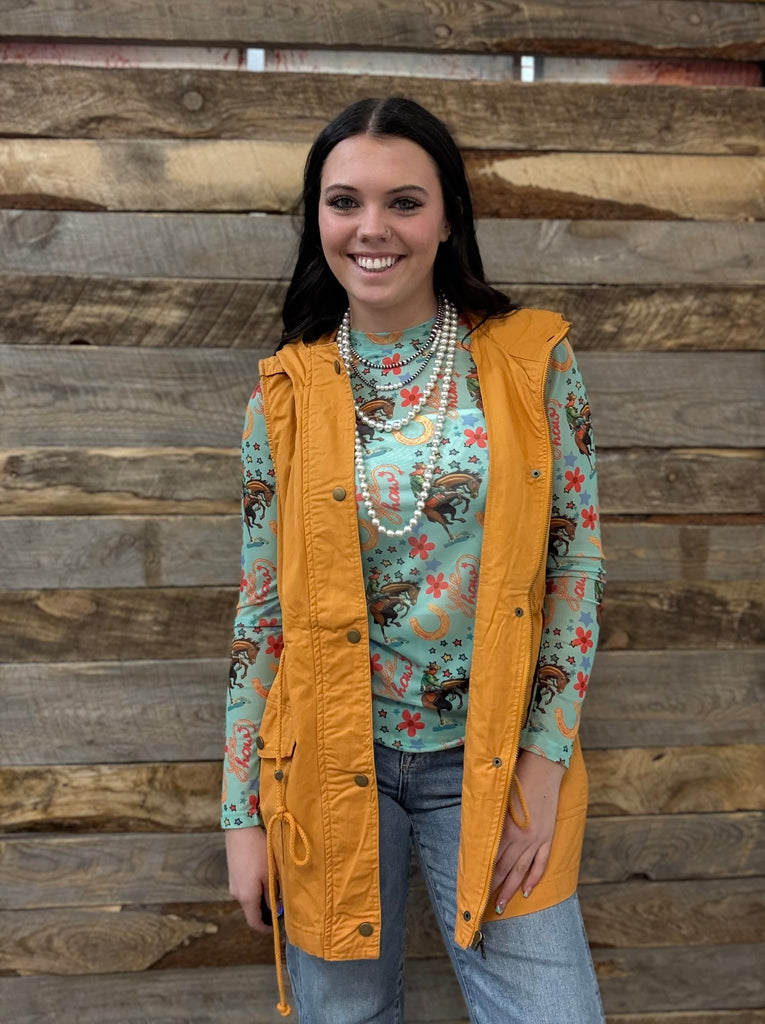 This long sleeve mesh top features a lively western-themed print on a turquoise base, including illustrated cowgirls, horses, red flowers, stars, horseshoes, and the phrase “Yeehaw” in playful script. Made from a stretchy, semi-sheer mesh fabric, the top offers a fitted silhouette with a crew neckline and full-length sleeves. Perfect as a layering piece or standout style for western boutiques and novelty apparel collections.
